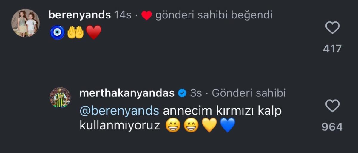 Annesi, deneyimli oyuncunun fotoğraf paylaşımını beğenirken, sarı-lacivertli oyuncunun "Anneciğim kırmızı kalp kullanmıyoruz." şeklinde yanıt vermesi dikkat çekti.