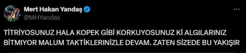 Serdar Aziz'in Galatasaray'ın Adana Demirspor'a attığı gole sevinmesine tepki gösterdiği ve savunma oyuncusuyla kavga ettiği öne sürülen Mert Hakan, "Titriyorsunuz hala, köpek gibi korkuyorsunuz ki algılarınız bitmiyor. Malum taktiklerinizle devam. Zaten size de bu yakışır" ifadelerini kullandı.