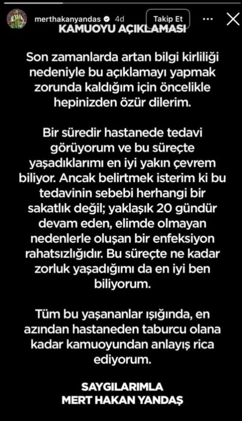 Son zamanlarda artan bilgi kirliliği nedeniyle bu açıklamayı yapmak zorunda kaldığını aktaran Mert Hakan, "Bir süredir hastanede tedavi görüyorum ve bu süreçte yaşadıklarımı en iyi yakın çevrem biliyor. Ancak belirtmek isterim ki bu tedavinin sebebi herhangi bir sakatlık değil. Yaklaşık 20 gündür devam eden, elimde olmayan nedenle oluşan bir enfeksiyon rahatsızlığıdır. Bu süreçte ne kadar zorluk yaşadığımı da en iyi ben biliyorum." ifadelerini kullandı.