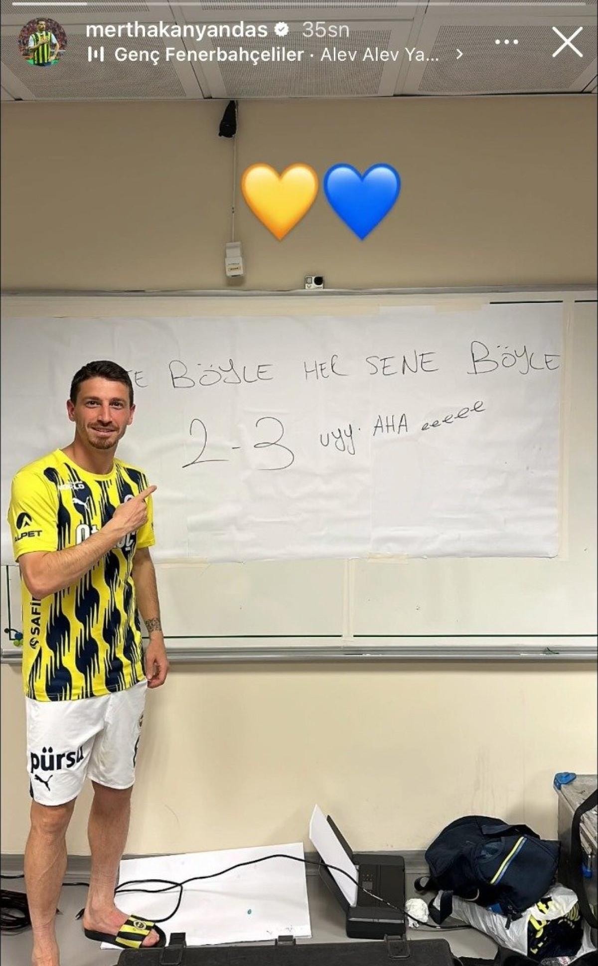 Milli futbolcunun gönderisinde beyaz tahta üzerinde yer alan "İşte böyle, her sene böyle 2-3! Uy aha!" ifadeleri dikkat çekti.