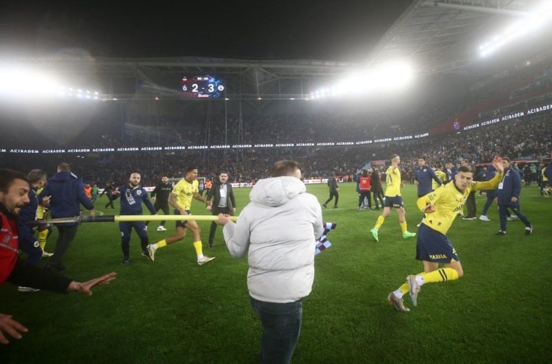 Trabzonsporlu taraftarlar maç sonrası sahaya girerek sevinen Fenerbahçeli futbolculara hücum etti.