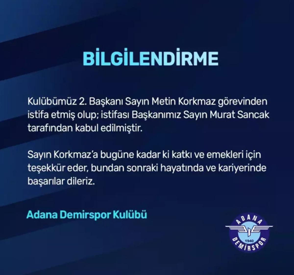 Süper Lig ekiplerinden Adana Demirspor'un ikinci başkanlığını yürüten Metin Korkmaz, görevinden istifa etti.