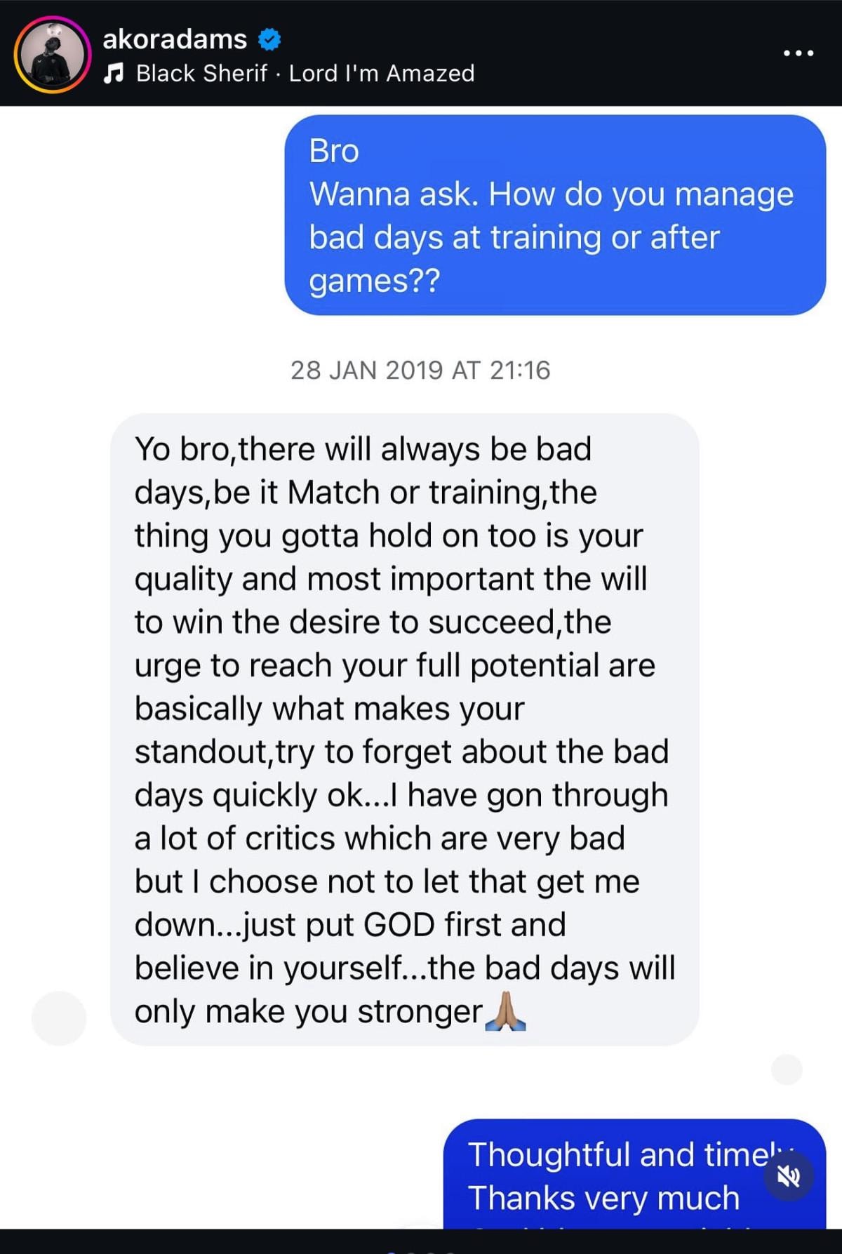 Osimhen'e sosyal medya üzerinden mesaj yoluyla antrenman sonrasında "Kötü günlerle nasıl başa çıkıyorsun?" diye soran Adams, aldığı cevapla adeta bir motivasyon dersi aldığını söyledi.