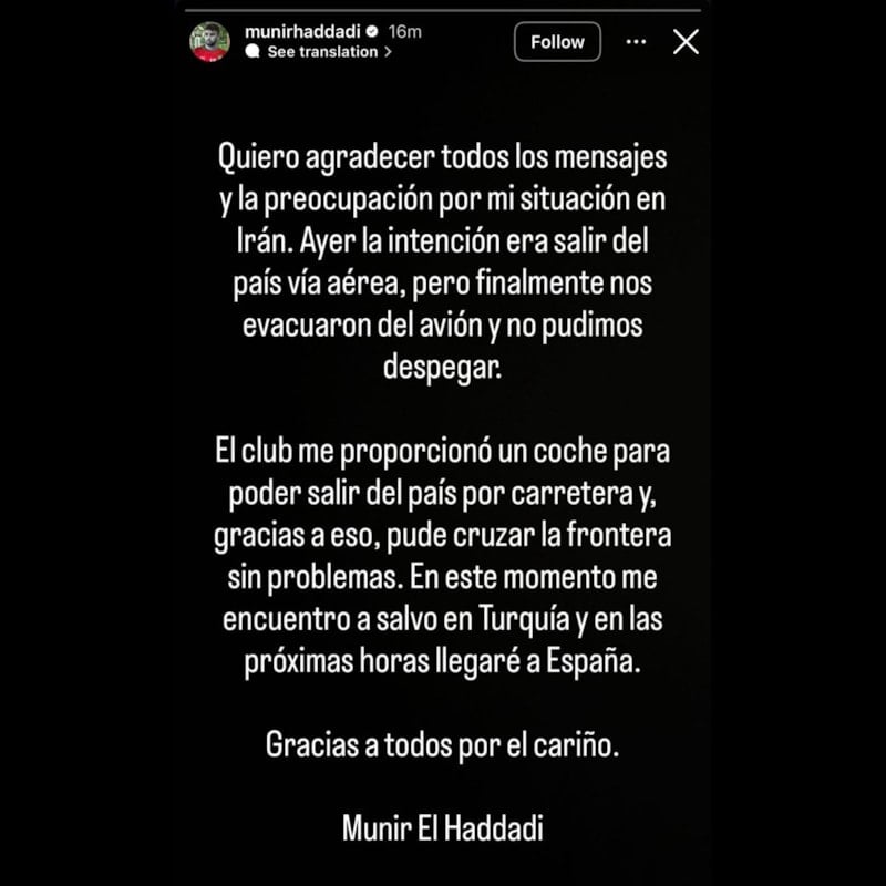 El Haddadi, sosyal medya platformu Instagram hesabından yaptığı paylaşımda, "İran'daki durumumla ilgili mesajlarınız ve endişeleriniz için herkese teşekkür etmek istiyorum. Dün ülkeyi uçakla terk etmeyi planlıyorduk ancak tahliye edildik ve kalkış yapamadık. Kulüp bana kara yoluyla ülkeyi terk edebilmem için bir araba sağladı ve bu sayede sınır geçişini sorunsuz bir şekilde gerçekleştirebildim. Şu anda Türkiye'de güvendeyim ve önümüzdeki birkaç saat içinde İspanya'ya varacağım. Desteğiniz için hepinize teşekkür ederim." ifadelerini kullandı.