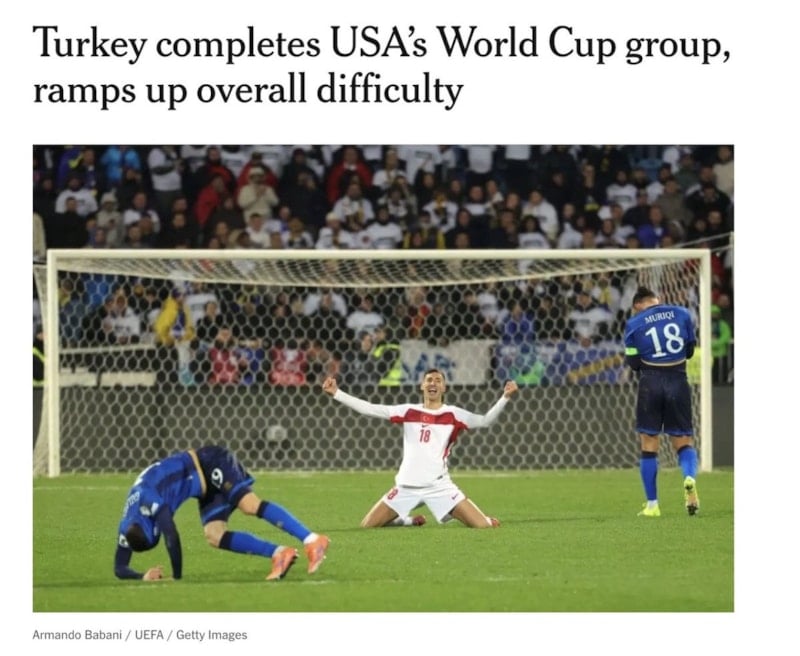 2026 Dünya Kupası'ndaki rakiplerimizden biri olan ABD'nin ünlü gazetelerinden New York Times, yaptığı haberde "Türkiye'nin D Grubu'ndaki son kontenjanı almasının ardından ABD'nin bir üst tura yükselme şansı, Amerikalı taraftarların ilk başta düşündüğünden daha zor hale geldi" ifadelerini kullandı.