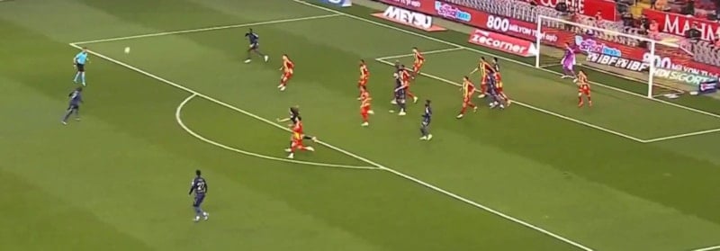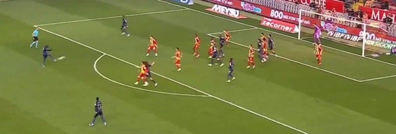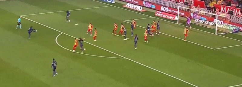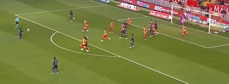 45+1. dakikada Kerem Aktürkoğlu'nun sağ kanattan kullandığı kornerde Kerem'in ortaladığı topu savunma kafayla karşıladı, ceza yayının gerisine açılan topa Kante sağ ayağının üstüyle gelişine vurdu.