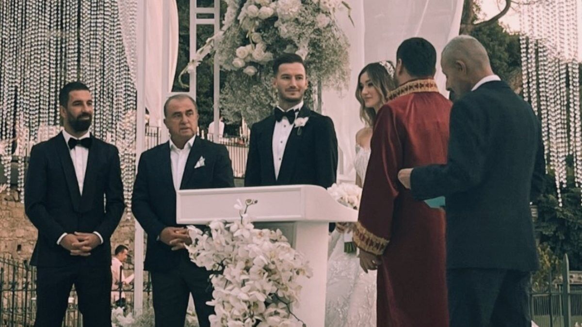 Galatasaray'dan ayrıldıktan sonra göz önünde olmayan ve Bodrum'a giden Fatih Terim de Arda Turan'la birlikte çiftin nikah şahidi oldu. Tecrübeli hocanın neşeli halleri gözlerden kaçmadı.