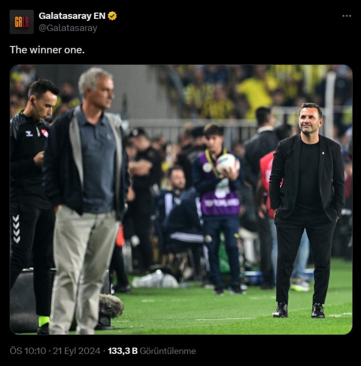 Okan Buruk'un Jose Mourinho'ya kulübeye oturmasını söylediği anda çekilen kare gündem oldu.