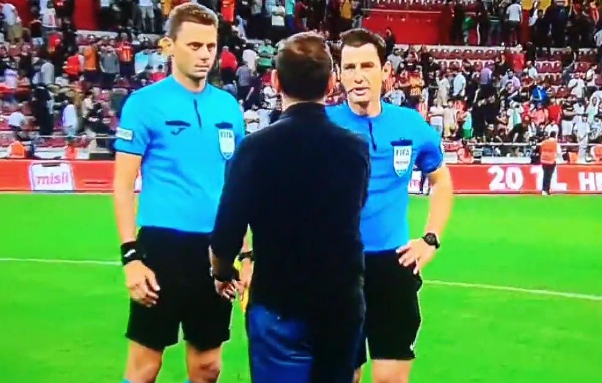 Buruk, daha sonra ise sahanın içine girerek mücadelenin hakemi Halil Umut Meler ve yardımcılarına tepki gösterdi.