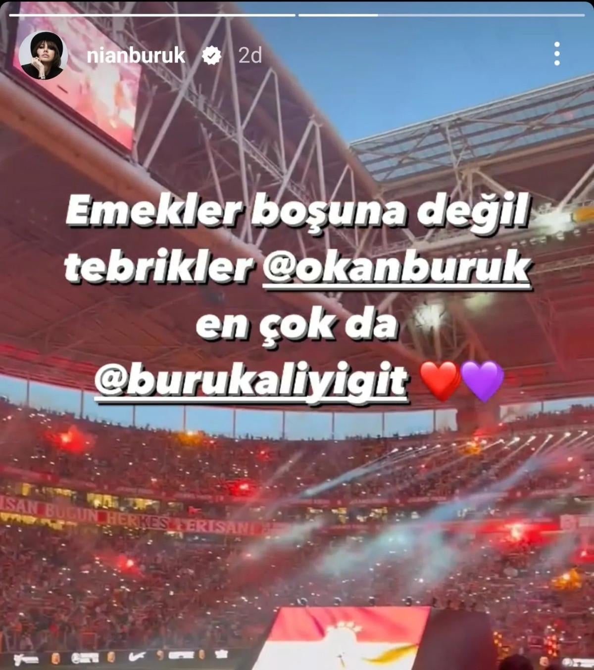 Galatasaray'ın şampiyonluğu sonrası Nihan Akkuş, Instagram hesabından, "Emekler boşuna değil tebrikler Okan Buruk. En çok da Ali Yiğit Buruk." paylaşımını yaptı.