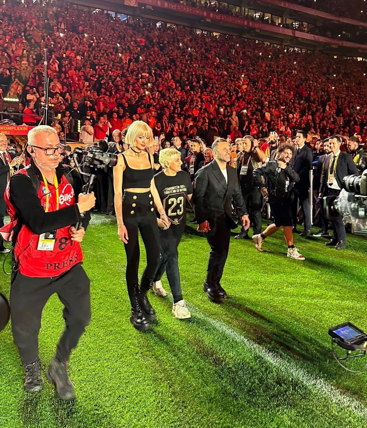 Buruk çifti, Galatasaray'ın geçen yılki şampiyonluk törenine ailecek çıkmıştı. Bu yıl ise Okan Buruk, oğlu Ali Yiğit'le sahneye çıktı.