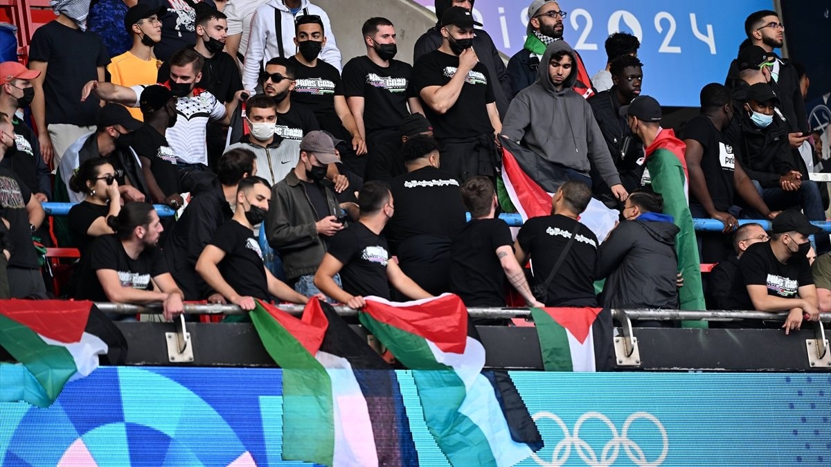 Müsabakayı izlemeye gelen bazı taraftarlar, 'Soykırım Olimpiyatları' pankartı açarak, İsrail'i protesto etti.