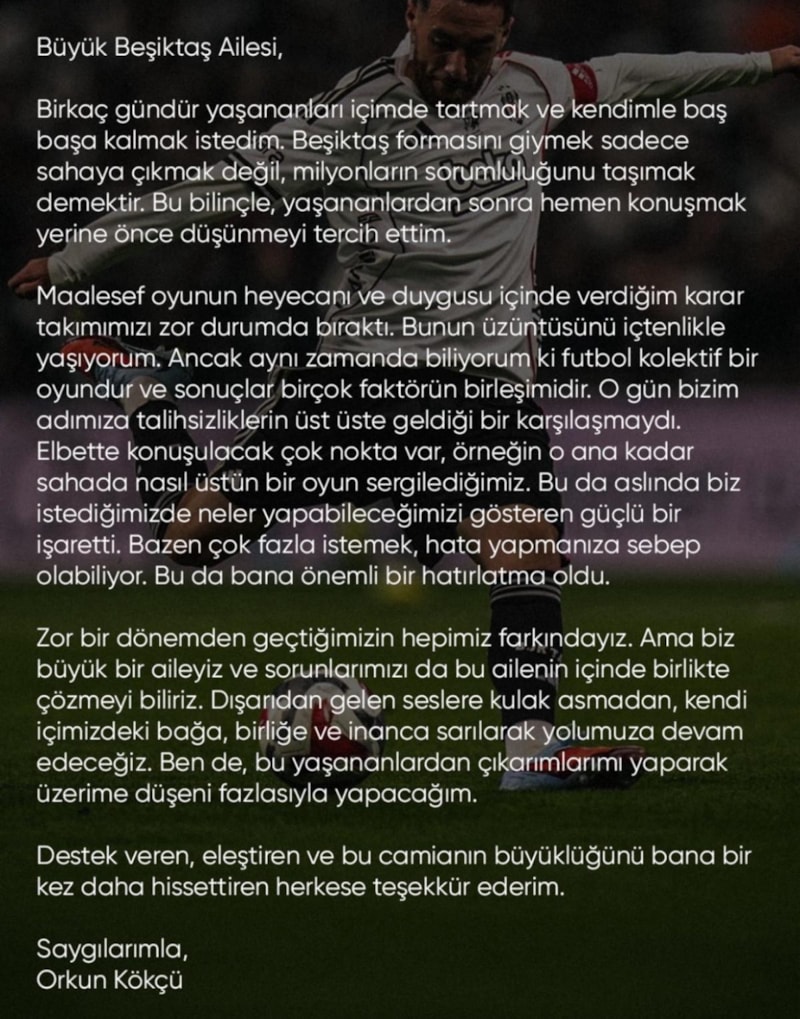 Birkaç gündür yaşananları içimde tartmak ve kendimle baş başa kalmak istedim. Beşiktaş formasını giymek sadece sahaya çıkmak değil, milyonların sorumluluğunu taşımak demektir. Bu bilinçle, yaşananlardan sonra hemen konuşmak yerine önce düşünmeyi tercih ettim.
