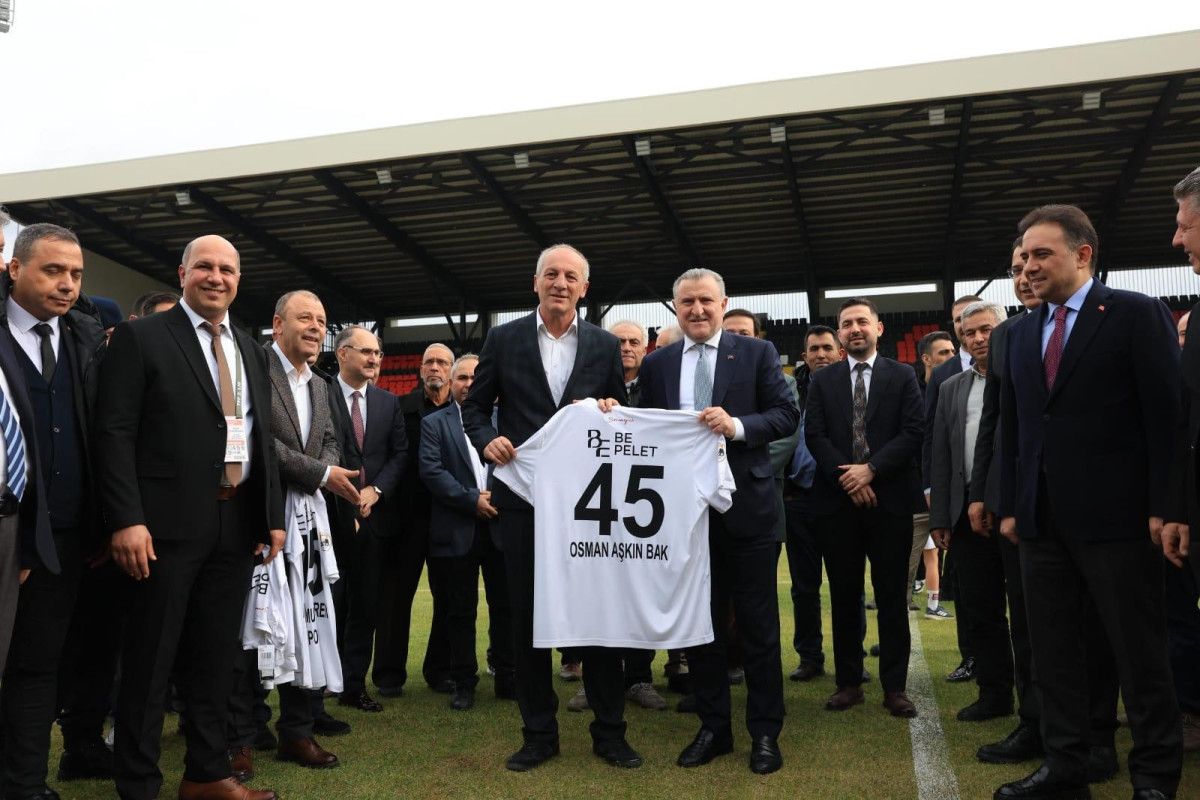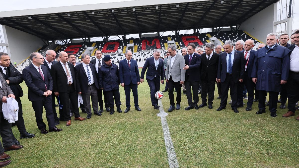 Tören öncesinde stadyum zeminini inceleyen ve çimleri kontrol eden Bakan Bak, futbol topuyla da sahayı test etti.