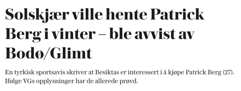 Norveç gazetesi Verdens Gang'in haberine göre Beşiktaş'ın Berg isteği, yalnızca ilgi boyutunda kalmadı ve siyah-beyazlı ekip ara transfer döneminde Norveçli oyuncu için teklifte bulundu.