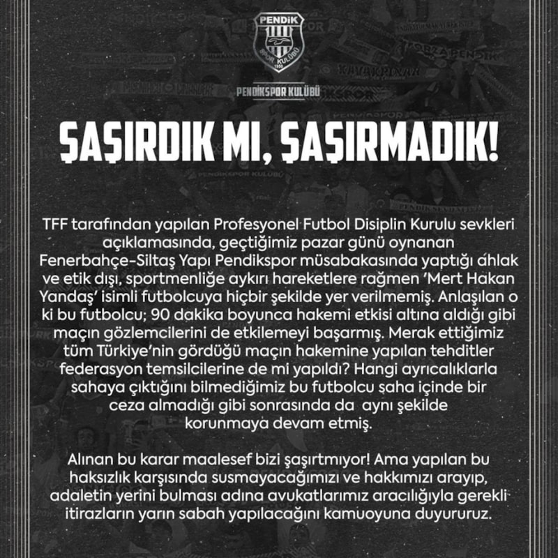 Karşılaşmanın ardından yaşananlara tepki gösteren Pendikspor, Mert Hakan Yandaş'ın Profesyonel Futbol Disiplin Kurulu'na sevk edilmemesi üzerine sosyal medya hesapları üzerinden açıklamada bulundu.
