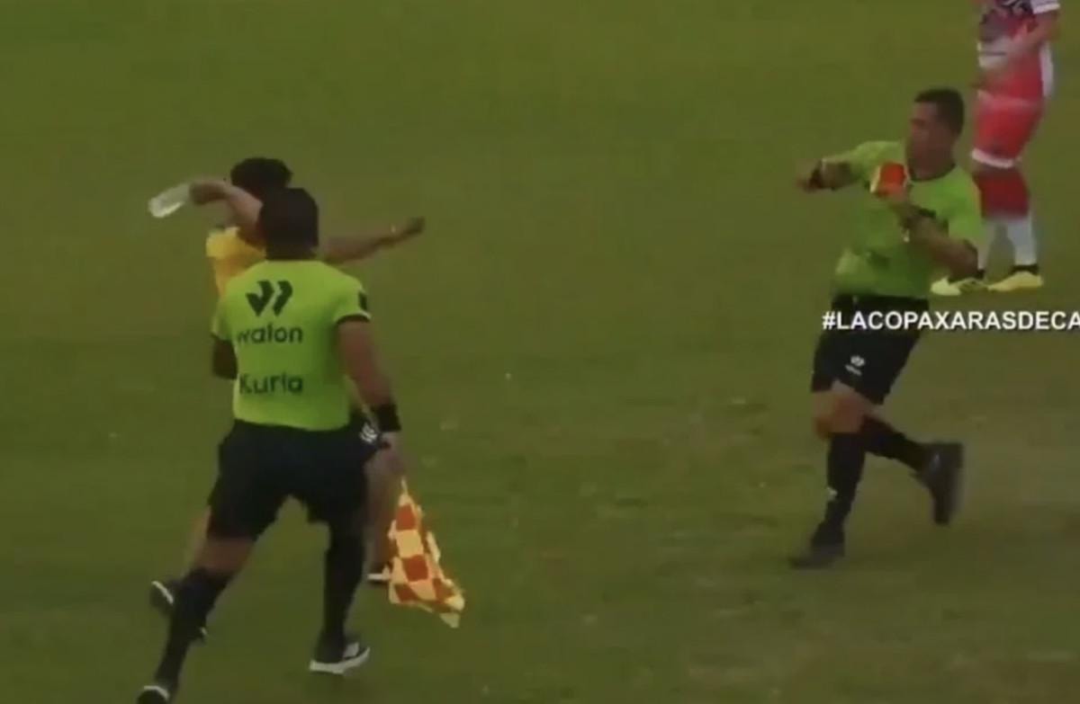 O sırada sahaya giren ve elinde plastik bir şişe bulunan antrenör, hakeme doğru koşmaya başladı.