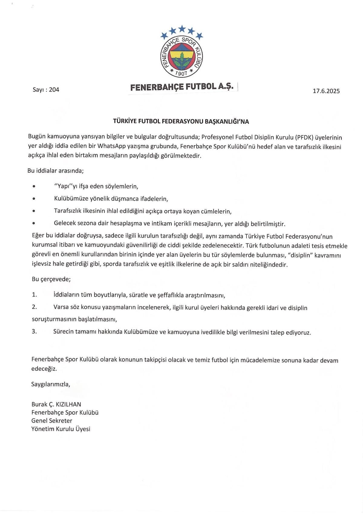 Fenerbahçe, PFDK üyelerine ait olduğu iddia edilen yazışmalarla ilgili bir açıklama yayınladı.