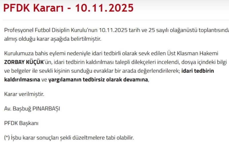 Profesyonel Futbol Disiplin Kurulu’nun 10.11.2025 tarih ve 25 sayılı olağanüstü toplantısında almış olduğu karar aşağıda belirtilmiştir.