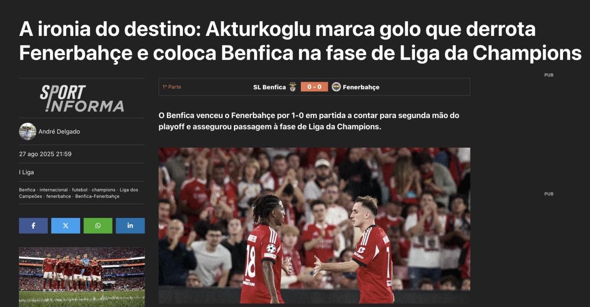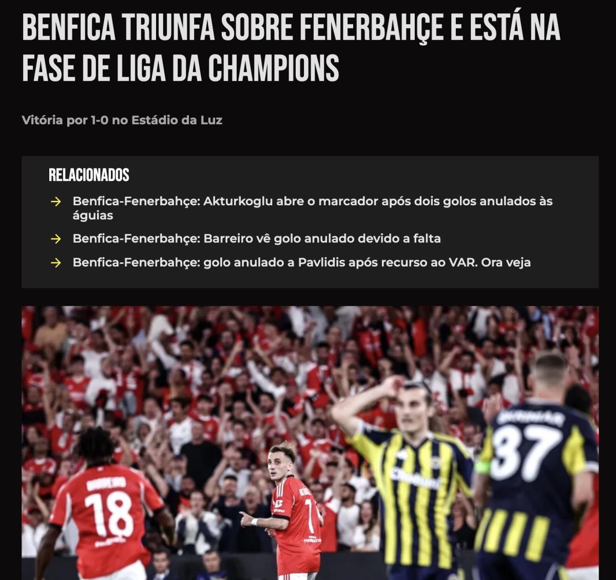 "Basitçe söylemek gerekirse güçlü olan kazandı. Benfica, Fenerbahçe karşısında daha iyi, daha organize ve daha kaliteli bir takımdı ve özellikle ilk yarıda Türkler için birçok sorun yarattılar. İkinci yarı daha dengeliydi ancak bu Fenerbahçe'nin onları geride bıraktığı anlamına gelmiyor."