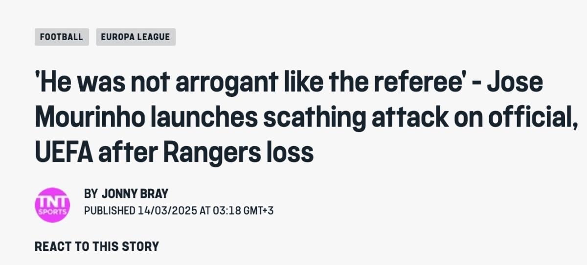 TNT: Jose Mourinho, Fenerbahçe'nin UEFA Avrupa Ligi'nde Rangers'a penaltılarla elenmesinin ardından hakem Espen Eskas'a sert sözlerle saldırdı.