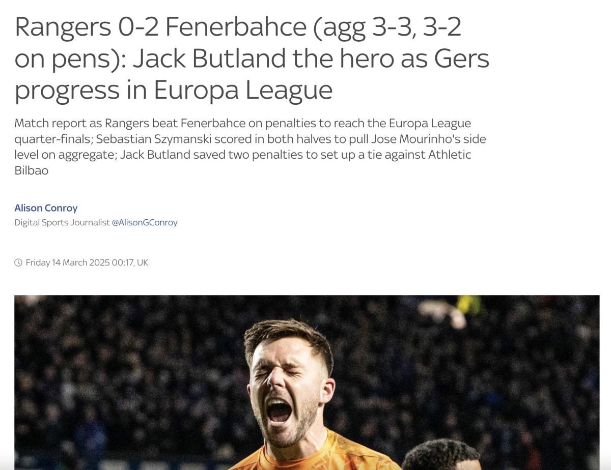 SkySports: "Ibrox'taki gergin gecede Rangers, Jack Butland'ın penaltı kahramanlığıyla Avrupa Ligi'nde çeyrek finale yükseldi."
