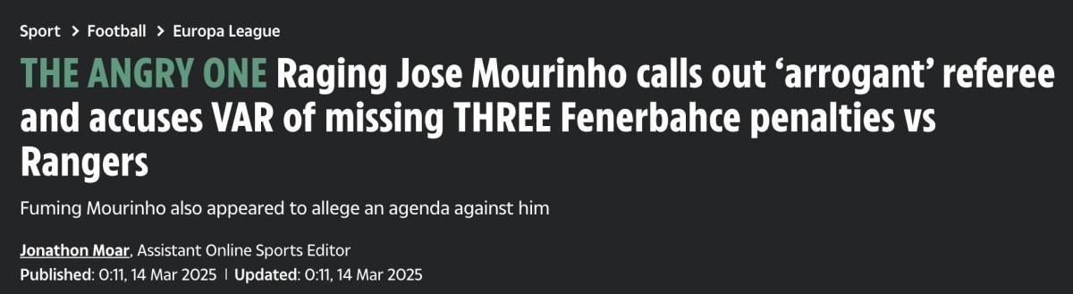 The Sun: "Öfkeli Mourinho, Rangers maçı sonrası hakemlerin Fenerbahçe'nin 3 penaltısını vermediğini söyledi. Maç sırasında kart gören Portekizli, hakemi de "kibirli" olarak nitelendirdi."
