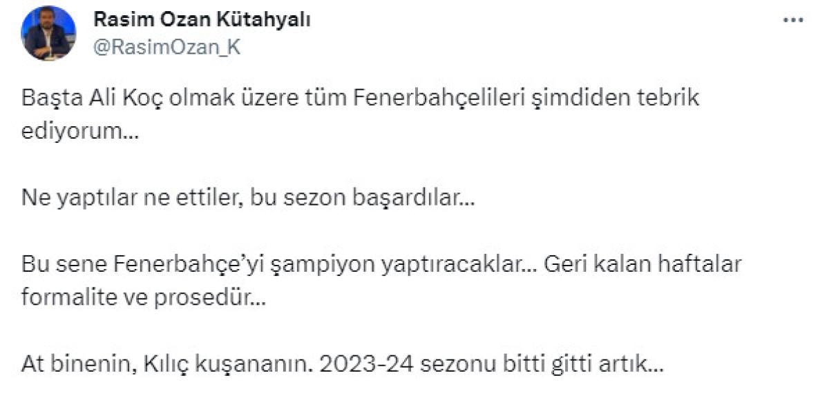Rasim Ozan Kütahyalı'nın bu paylaşımı sosyal medyada tepki topladı. Fenerbahçeli taraftarlar, bu paylaşımın altına binlerce yorum yaptı.