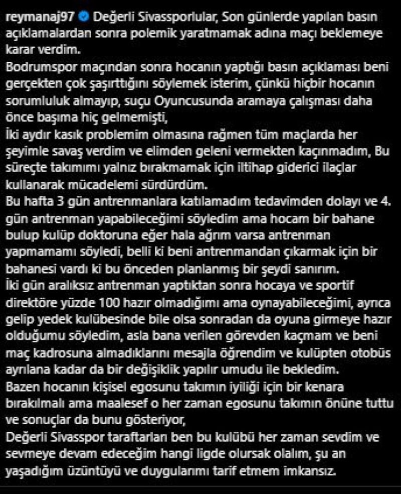 Sivasspor'da kadroya alınmayan Rey Manaj, karşılaşmanın ardından çarpıcı bir paylaşım yaptı.