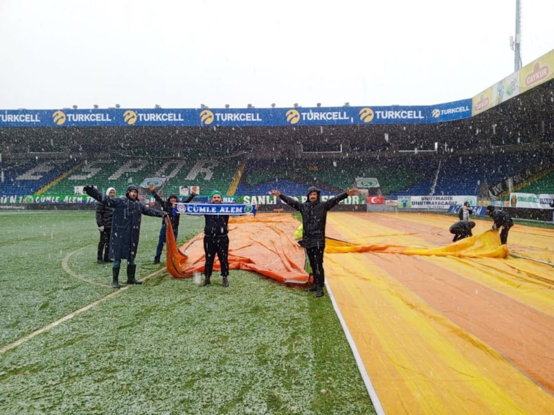 Saha zemini müsabaka saatine kadar tekrardan kar dolmaması için çabalayan stadyum görevlileri, yeni bir kar yağışı için de hazırlıklı olarak bekliyor.
