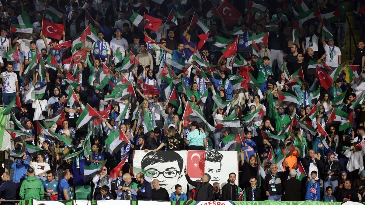 Takımlarını desteklemek için tribündeki yerini alan binlerce Rizespor taraftarı, Filistin bayrağı ve atkıları açarak Filistin lehine sloganlar attı, dua etti.