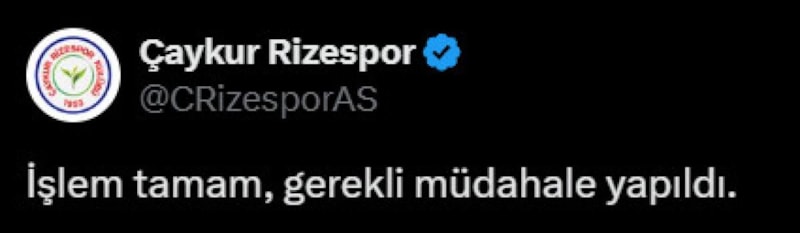 Skor 2-2 iken Qazim Laçi'nin kırmızı kart görmesiyle 10 kişi kalan Rizespor, "İşlem tamam, gerekli müdahale yapıldı." paylaşımı yaptı.