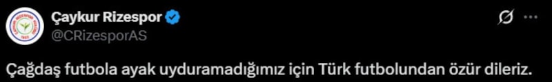 Öte yandan maç sonu bir paylaşım daha yapan Rizespor, hakem Çağdaş Altay'a gönderme yaparak "Çağdaş futbola ayak uyduramadığımız için Türk futbolundan özür dileriz." ifadelerini kullandı.