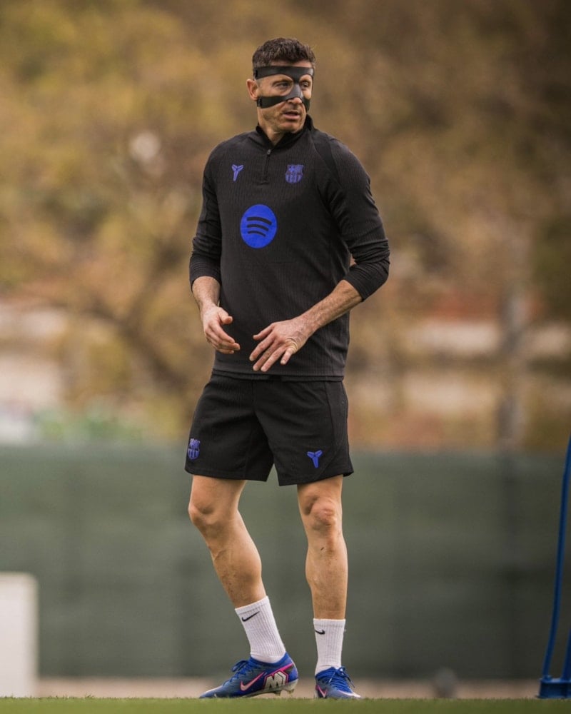 Villarreal maçında sol göz çukurunun iç köşesinde kemik kırığı oluşan Robert Lewandowski, bugünkü idmana koruyucu maskeyle çıktı.