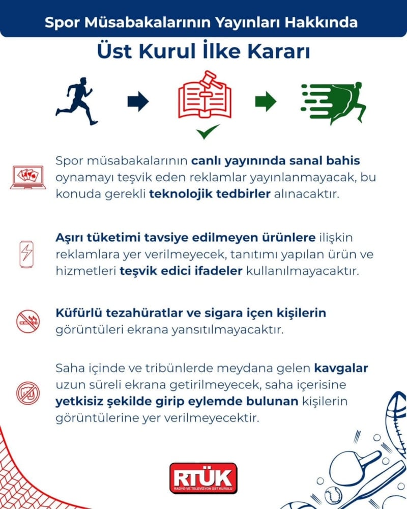 RTÜK’ten yapılan açıklamada, "Radyo ve Televizyon Üst Kurulu, 6112 sayılı Radyo ve Televizyonların Kuruluş ve Yayın Hizmetleri Hakkında Kanun çerçevesinde, İzleme ve Değerlendirme Dairesi Başkanlığı’nın raporu ve eklerini inceleyerek spor müsabakalarının yayınlarında ortaya çıkan uygulamaları ele aldı. Bu değerlendirmeler sonucunda, tarafsızlık, adil temsil ve evrensel spor değerlerine uygunluğu güçlendirmek amacıyla yeni ilke kararları aldı. RTÜK’ün amacı, spor yayınlarında tribün ve saha görüntülerinin tarafsız şekilde ekrana taşınmasını, spiker ve yorumcuların belirli takımlar veya taraftarlar lehine yorum yapmaktan kaçınmasını ve izleyicilere şiddet veya fanatizmi özendirmeyen bir yayın sunulmasını sağlamaktır. Böylece özellikle genç izleyicilere pozitif ve örnek teşkil eden bir spor deneyimi sunulması; sporda tarafsızlığın sağlanması ve izleyicilere güvenli, olumlu bir yayın deneyimi yaşatılması hedefleniyor." ifadelerine yer verildi.