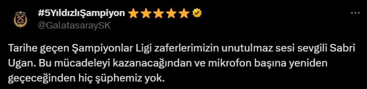Öte yandan Galatasaray Kulübü, Sabri Ugan ile ilgili resmi hesabından bir paylaşım yaptı. Sarı-kırmızılılar, şu ifadeleri kullandı: