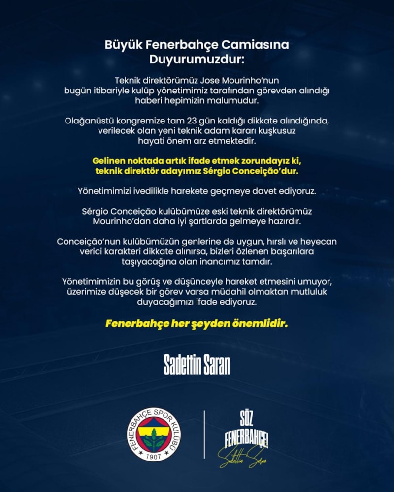 Yönetimimizi ivedilikle harekete geçmeye davet ediyoruz. Sérgio Conceiçao kulübümüze eski teknik direktörümüz Mourinho'dan daha iyi şartlarda gelmeye hazırdır.