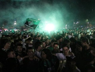 Bursa'da Büyükşehir Belediye Stadında Sakaryaspor ile Karagümrükspor arasında gerçekleşen TFF 2. Lig play-off final maçına gidemeyen taraftarlar için Sakarya Demokrasi Meydanında dev ekran kuruldu.