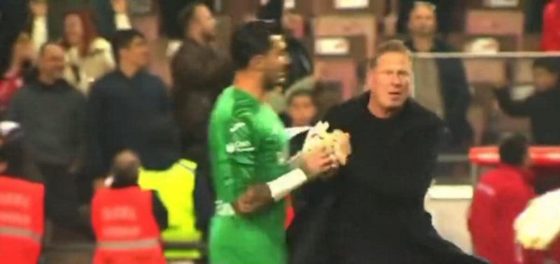 Trabzonspor kaptanı Uğurcan Çakır, müsabakanın ardından kutlama için sahaya giren Samsunspor Teknik Direktörü Markus Gisdol'e doğru yöneldi.