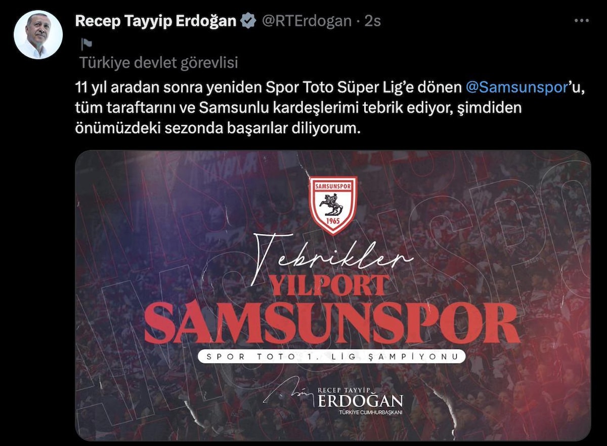 Erdoğan, Twitter hesabından yaptığı paylaşımda, "11 yıl aradan sonra yeniden Spor Toto Süper Lig'e dönen Samsunspor'u, tüm taraftarını ve Samsunlu kardeşlerimi tebrik ediyor, şimdiden önümüzdeki sezonda başarılar diliyorum." ifadesini kullandı.