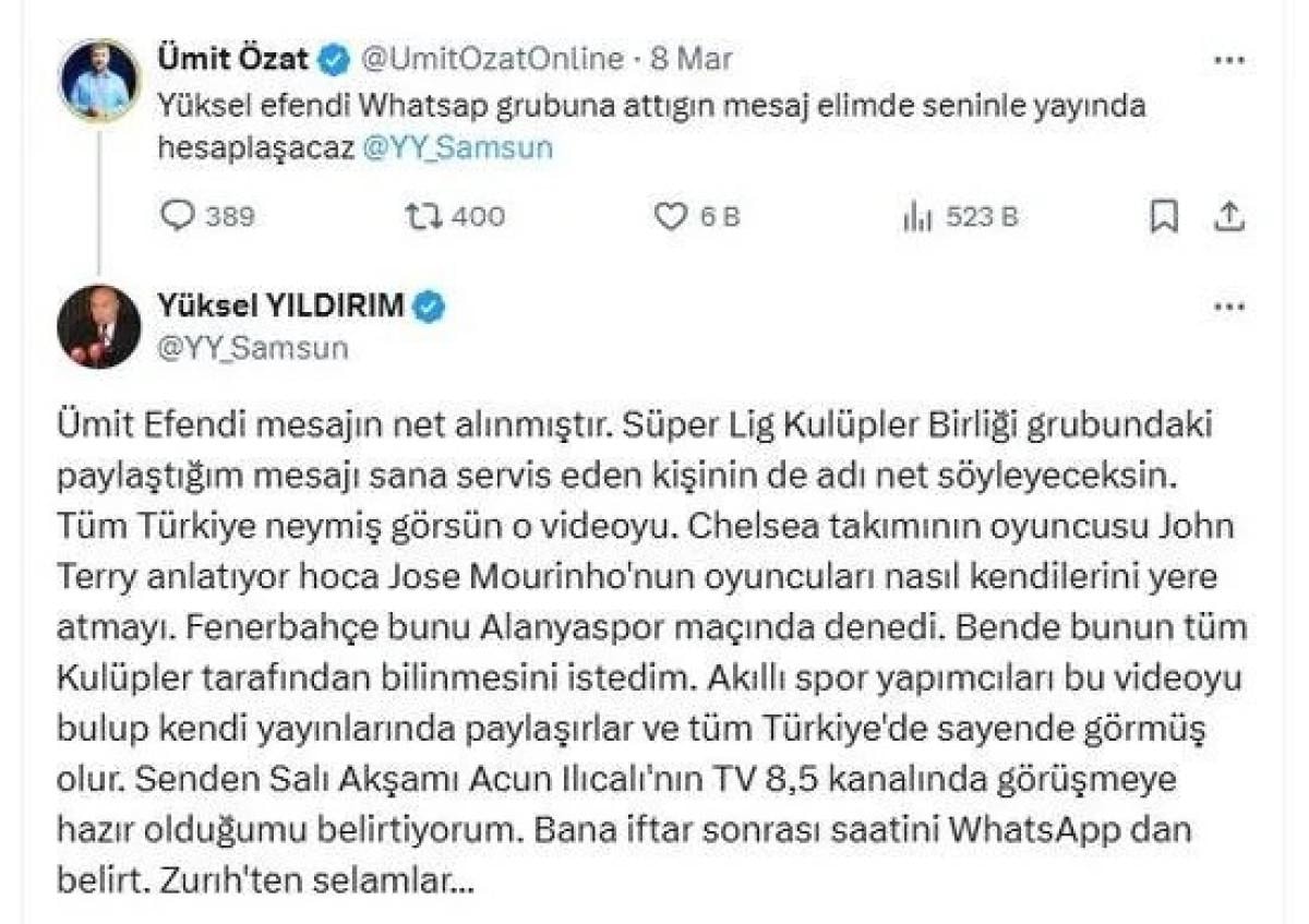 "Ümit Efendi mesajın net alınmıştır. Süper Lig Kulüpler Birliği grubundaki paylaştığım mesajı sana servis eden kişinin de adı net söyleyeceksin. Tüm Türkiye neymiş görsün o videoyu. Chelsea takımının oyuncusu John Terry anlatıyor, hoca Jose Mourinho'nun oyuncuları nasıl kendilerini yere atmayı. Fenerbahçe bunu Alanyaspor maçında denedi. Ben de bunun tüm kulüpler tarafından bilinmesini istedim. Akıllı spor yapımcıları bu videoyu bulup kendi yayınlarında paylaşırlar ve tüm Türkiye'de sayende görmüş olur."