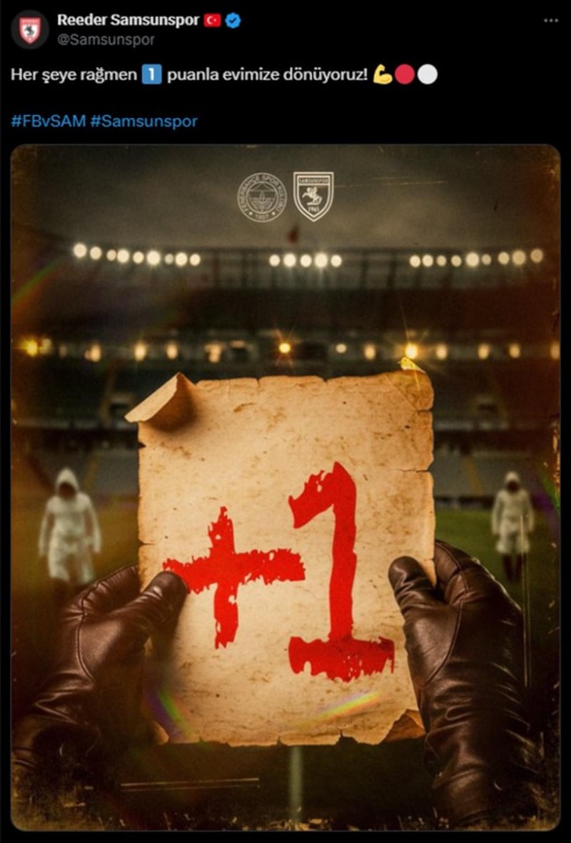 Samsunspor, Fenerbahçe beraberliğinin ardından, "Her şeye rağmen 1 puanla evimize dönüyoruz" paylaşımında bulundu.