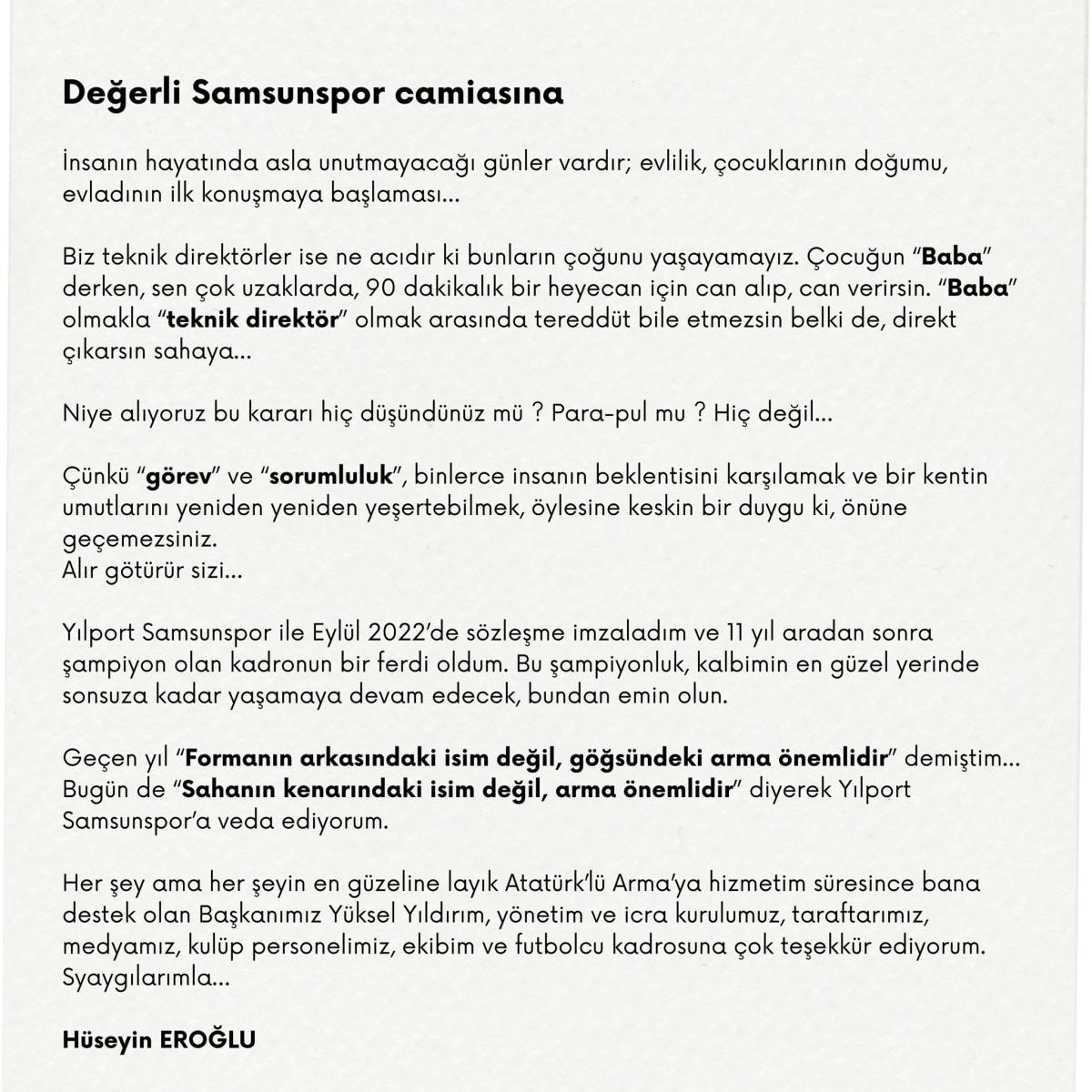 Kıymetli Hüseyin Eroğlu'na, Samsunsporumuza yaptığı katkılar ve yaşattığı mutluluklar için teşekkür eder, bundan sonraki kariyerinde başarılar dileriz." denildi.