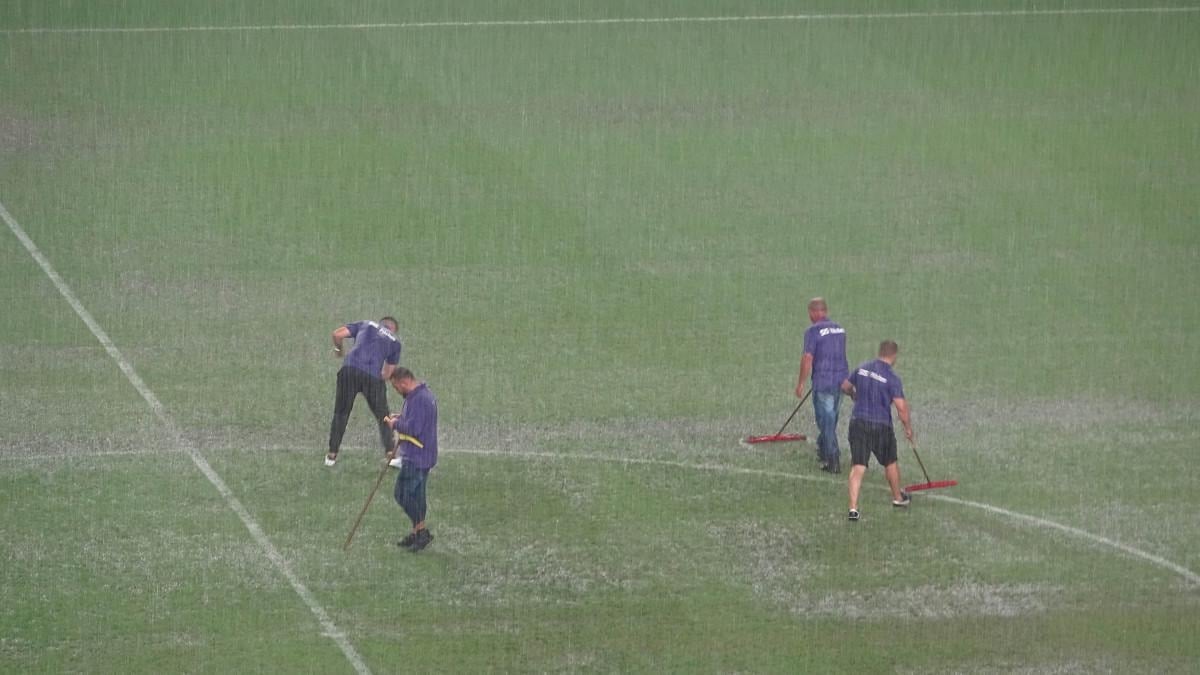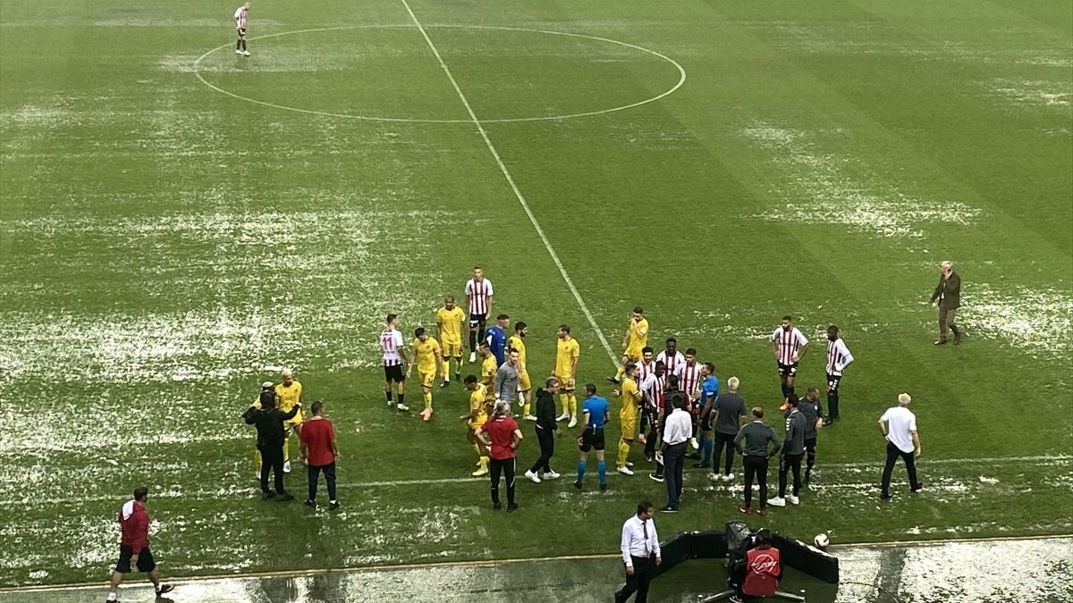 Yağmur etkisini azaltmayınca tekrar yardımcılarıyla birlikte sahaya giren hakem Burak Şeker, birkaç denemeden sonra da top sekmeyince her 2 takımın kaptanları ve teknik direktörlerini yanına çağırarak karşılaşmanın ertelendiğini bildirdi.