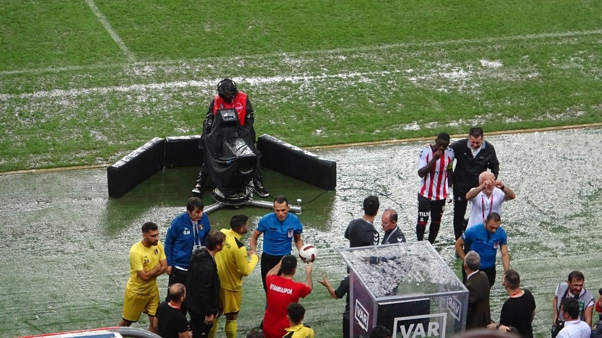 Mücadelenin hakemi Burak Şeker, maçın 12. dakikasında topun zeminde sekmediğini ve ilerlemediğini fark edince maçı durdurdu.