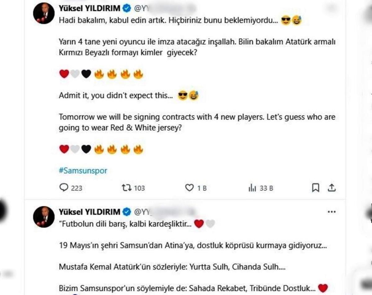 UEFA’ya kadro listesi göndermeye kısa bir süre kala kendisine ait sosyal medya hesabından açıklamada bulunan Samsunspor Başkanı Yüksel Yıldırım, "Hadi bakalım, kabul edin artık. Hiçbiriniz bunu beklemiyordu. 4 tane yeni oyuncu ile imza atacağız inşallah. Bilin bakalım Atatürk armalı kırmızı-beyazlı formayı kimler giyecek?" dedi.