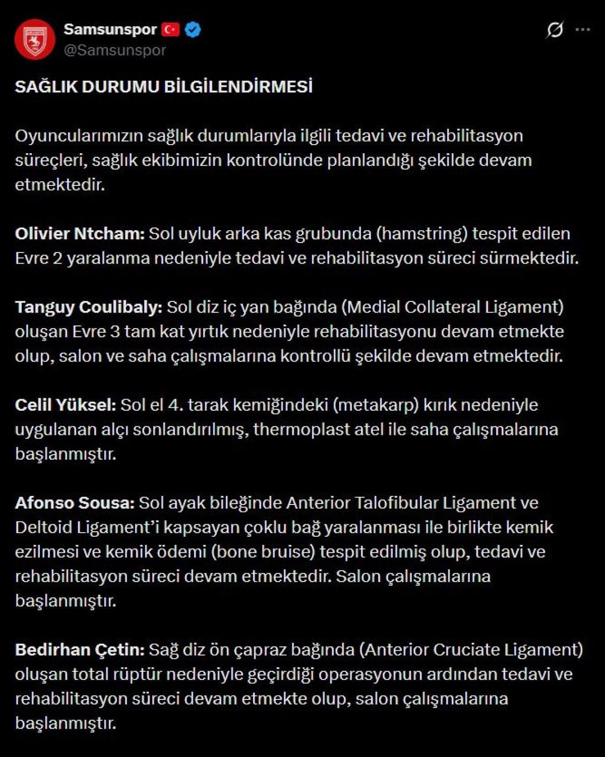 Oyuncularımızın sağlık durumlarıyla ilgili tedavi ve rehabilitasyon süreçleri, sağlık ekibimizin kontrolünde planlandığı şekilde devam etmektedir. Olivier Ntcham’ın sol uyluk arka kas grubunda (hamstring) tespit edilen evre 2 yaralanma nedeniyle tedavi ve rehabilitasyon süreci sürmektedir. Tanguy Coulibaly’nin sol diz iç yan bağında (Medial Collateral Ligament) oluşan evre 3 tam kat yırtık nedeniyle rehabilitasyonu devam etmekte olup, salon ve saha çalışmalarına kontrollü şekilde devam etmektedir. Celil Yüksel’in sol el 4. tarak kemiğindeki (metakarp) kırık nedeniyle uygulanan alçı sonlandırılmış, thermoplast atel ile saha çalışmalarına başlanmıştır. Afonso Sousa’nın sol ayak bileğinde Anterior Talofibular Ligament ve Deltoid Ligament’i kapsayan çoklu bağ yaralanması ile birlikte kemik ezilmesi ve kemik ödemi (bone bruise) tespit edilmiş olup, tedavi ve rehabilitasyon süreci devam etmektedir. Salon çalışmalarına başlanmıştır. Bedirhan Çetin’in sağ diz ön çapraz bağında (Anterior Cruciate Ligament) oluşan total rüptür nedeniyle geçirdiği operasyonun ardından tedavi ve rehabilitasyon süreci devam etmekte olup, salon çalışmalarına başlanmıştır.