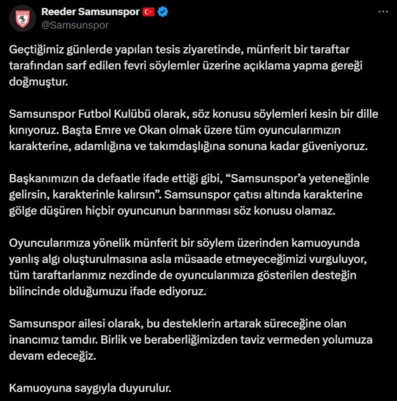 Samsunspor Futbol Kulübü olarak, söz konusu söylemleri kesin bir dille kınıyoruz. Başta Emre ve Okan olmak üzere tüm oyuncularımızın karakterine, adamlığına ve takımdaşlığına sonuna kadar güveniyoruz.
