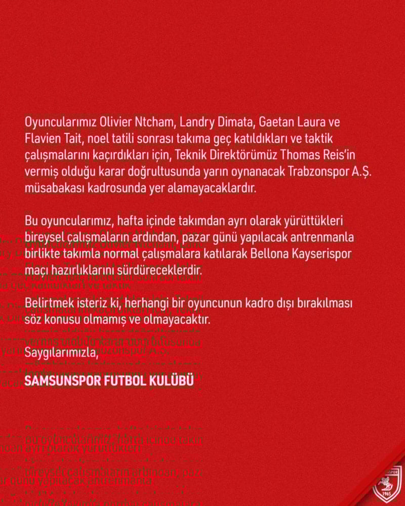 Oyuncularımız Olivier Ntcham, Landry Dimata, Gaetan Laura ve Flavien Tait, noel tatili sonrası takıma geç katıldıkları ve taktik çalışmalarını kaçırdıkları için, Teknik Direktörümüz Thomas Reis'in vermiş olduğu karar doğrultusunda yarın oynanacak Trabzonspor A.Ş. müsabakası kadrosunda yer alamayacaklardır. Bu oyuncularımız, hafta içinde takımdan ayrı olarak yürüttükleri bireysel çalışmaların ardından, pazar günü yapılacak antrenmanla birlikte takımla normal çalışmalara katılarak Bellona Kayserispor maçı hazırlıklarını sürdüreceklerdir. Belirtmek isteriz ki, herhangi bir oyuncunun kadro dışı bırakılması söz konusu olmamış ve olmayacaktır.