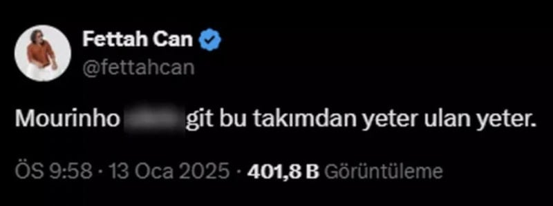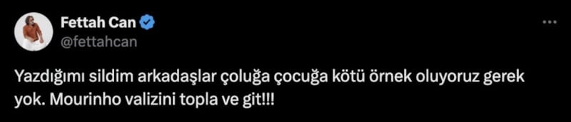 Şarkıcı Fettah Can, Fenerbahçe'nin Konyaspor'u 3-2 yendiği lig maçının ardından teknik direktör Jose Mourinho'ya küfürlü tepkide bulundu. Sarı-lacivertli taraftar, daha sonra ise yaptığı küfürlü paylaşımı kaldırdı.